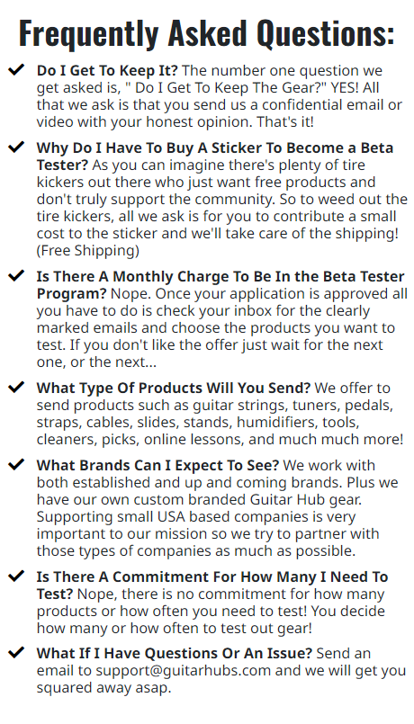 Guitar Hub is a purveyor of kick-ass guitar gear, accessories, and experiences. We curate the latest and greatest guitar-related items and offer them for FREE or heavily discounted to our members in exchange for their honest reviews. By joining our beta tester program you will gain access to an exclusive community that centers around the love of all things GUITAR!